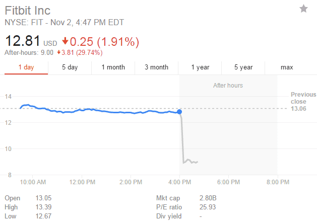 Fitbit周四公布的財報顯示,該公司第三季度調整后每股盈利19美分,符合分析師預期,但收入5.04億美元,不及預期的5.07億美元。此外,Fitbit公布的第四季度盈利指引顯示,該公司預期第四季度收入在7.25億至7.5億美元之間,不及分析師此前預測該公司第四季度收入為9.851億美元。Fitbit股票自2015年6月18日上市以來已下跌逾55%,在周三盤后跌至9美元以下,創紀錄新低。
