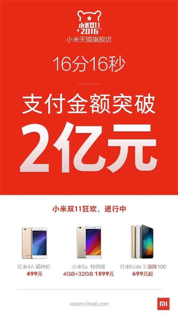 11日零點,小米天貓雙11正式開始,截止到00時5分23秒,小米天貓旗艦店銷售額已經超過一億元,而第16分16秒小米天貓旗艦店支付破2億。