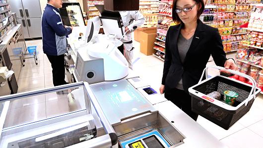 松下和羅森連鎖便利店(Lawson)日前開始測試一套機器人收銀系統。無需人工干預,一臺機器就能為便利店的購物者結賬,并將商品裝袋。顧客可用現金或銀行卡結賬。付款后,購物筐底部會自動打開,顧客購買的商品就掉到下面的包裝袋中。由松下研發的這套系統名為“Reji Robo”(register robots的簡稱,即結賬機器人),本周起開始在大阪的一家羅森連鎖便利店內進行測試。如果成功,羅森計劃下一財年將至少在10家連鎖便利店內部署該結賬系統,2018年起在全國部署。